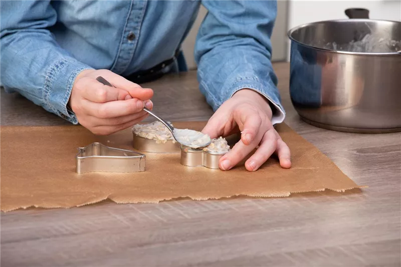 Wartet ab, bis euer Pflanzenfett mit den Leckereien soweit abgekühlt ist, dass es zähflüssig wird und füllt es dann in die Ausstechförmchen. Wenn der Brei noch zu flüssig ist, läuft er aus den Förmchen heraus. Das wollen wir ja nicht.