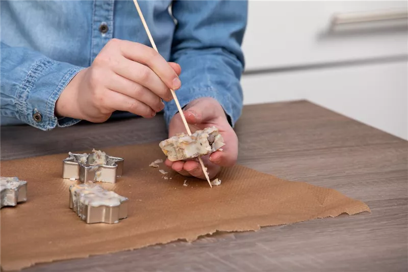 Wenn euer Futterbreit komplett kalt geworden ist, könnt ihr ihn vorsichtig aus den Förmchen drücken. Stecht dann mit einem spitzen Gegenstand vorsichtig ein Loch in den Futterbrei und fädelt eine schöne Kordel zum Aufhängen durch.